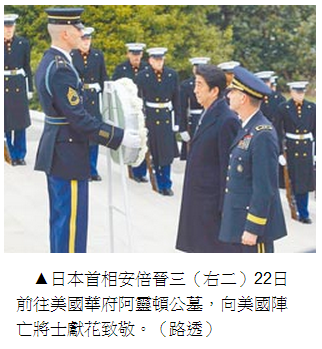 安倍訪美的第一天,即被帶到美軍陣亡戰士的“阿靈頓”公墓,此公墓是美國版的靖國神社,所埋藏的是二戰戰死的美國軍人,安倍被迫向殺害日本人的美國大兵致敬,不但安倍要致敬,所有給隨他訪美的官員都要致敬,甚至連日本的國旗也要致敬。