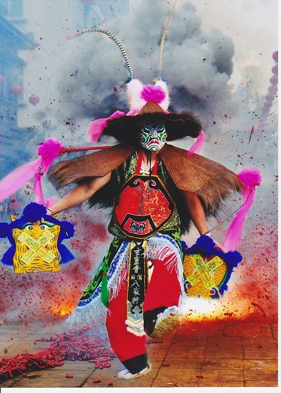 戴斗笠、穿蓑衣、扛著刑具的開臉刑具爺。圖片來源:pinterest