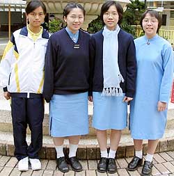 上圖為香港真光女子書院的校服,左為冬季體育制服、右為冬季制服。真光書院自小學創校算起,在香港已有75年的歷史,若從1872年廣州創校算起,則已將近140年。有趣的是,她是美國基督教士所創,亦是中國女子學校的先河,而其制服,至今進入21世紀,仍然是淺藍色的旗袍樣式。