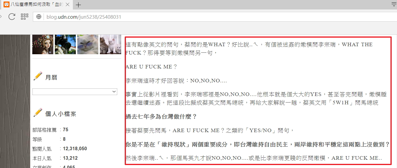 jun5238於http://blog.udn.com/jun5238/25408031以李宗瑞迷姦犯罪談政治,如下: