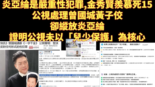 👉 曾國城的言論或許值得討論,但與炎亞綸的性剝削行為相比,前者根本不能相提並論。公視應該將焦點放在行為的嚴重性,而非僅僅「輿論壓力」。