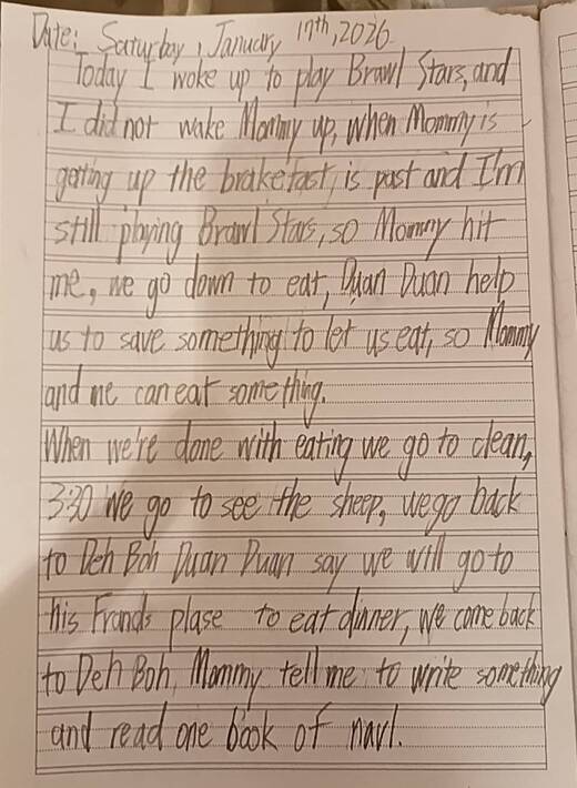 I woke up at 8 am to play Brawl Stars and I did not wake Monmy up this morning. The breakefast time was past when Mommy got up and I was still playing so she felt upset and punished me for not being able to control play time and failing of keeping my promise to be responsible. I shall improve my discipline.