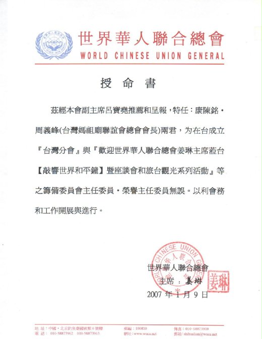 世華會授權呂寶堯特任康陳銘‧周義峰承辦在台敲響世界和平鐘