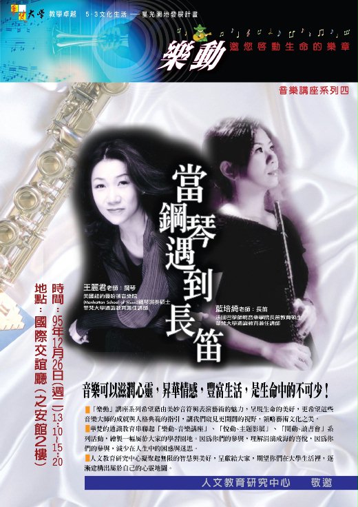 95年12月25日下午,華梵大學教學卓越5-3文化生活-星光園地計畫,音樂講座活動系列四很榮幸地邀請到通識教育二位音樂老師王麗君老師與藍培綺老師來校表演並與大家分享她們的學琴過程與留學生活甘苦談。