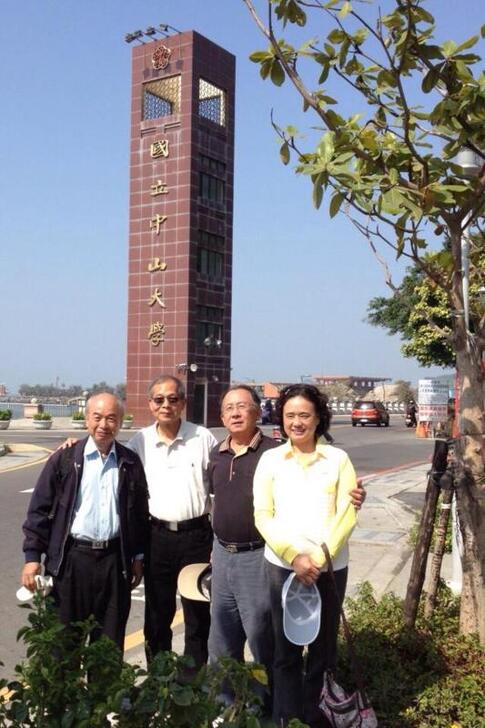 在中山大學的標牌前與 Charles 和惠長伉儷合影