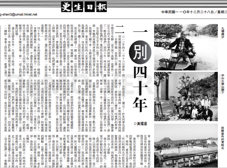 首先,我想分享在 2013 年十一月,我們南部之旅的一些照片。這是多年來,我第一次參加老同們所舉辦的活動。我曾寫了一篇題為「一別四十年」的文章,刊登在更生日副刊。