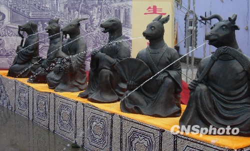 由江蘇農民企業家冷貝生先生精倣的圓明園十二生肖獸首人身復原像首次正式向世人亮相。據了解,此次圓明園十二生肖獸首人身復原工程是由冷貝生的公司在北京圓明園管理處的指導下,採取了同比例、同材質的復原制作方式,並且攻克了一百五十年前十二生肖的噴水報時功能這一難關,展現在人們面前的十二生肖獸首人身像與文物大小、材質完全一致。