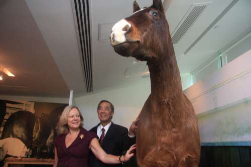 展品當中最特別的是於○五年去世的一代馬王「翠河」的標本。「翠河」服役期間三奪馬王榮譽,亦是香港賽馬史上唯一一匹三冠馬王,於九三至九四年度的馬季,先後勝出董事杯、香港金杯及香港冠軍暨遮打杯三項大賽。
