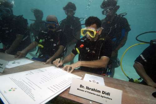 納希德、副總統瓦希德和十二名內閣成員在水下進行了半小時的會議,其間用防水筆簽署了一份向世界「求救」的決議。決議印在一塊白板上,稱:「我們必須全球團結一致地阻止氣溫進一步上升。氣候正在變化,威脅著地球上每個人的權利和安全。」