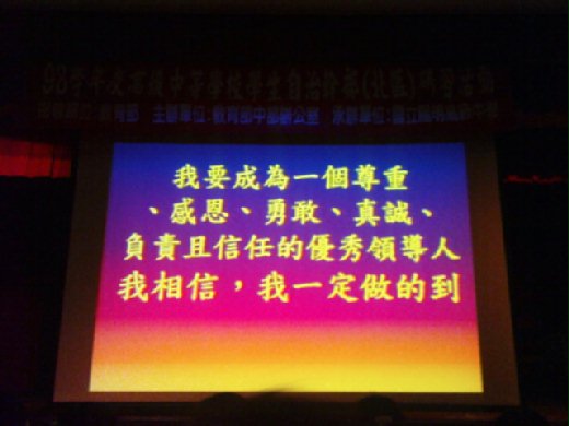 在來是永不忘記的「合作學習、互相成長」,除了是個成果的小發表之外,也是一個很重要的課程,在各各不同領與的小隊裡,運用了歌舞劇,來詮釋「尊重」、「感恩」、「勇敢」、「真誠」、「負責」、「信任」,不管是在班級、社團、班聯會等…這六個元素都是互相牽絆的,而我們第三小組要呈現的是「勇敢」,這次第一次和那麼多人去構思依個戲劇,一起演出,好喜歡大家享受在舞台的每分每秒(內心跟著吶喊著),不畏懼、不害怕,誇張的演出是需要多大的勇氣呢?真的不管是那一組其實大家也展現出「勇氣」的精神,也讓我知道在一個團體甚至是在未來我們即將會踏上社會這塊版圖,我們一定要懂得與他人合作學習,鼓勵彼此帶動整個世紀,創造「好,很好,非常好的 YES 」軍團,不只自己好而已,把所有的事務懂的分享,肩並肩的作戰,讓許多人一起加入,優秀領導者軍團!「我相信,我一定可以做得到」!