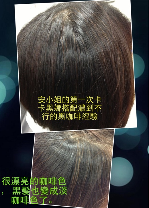 搭配卡卡黑娜, 以標準程序保養完後, 黑髮呈現淡咖啡色, 白髮是咖啡金。