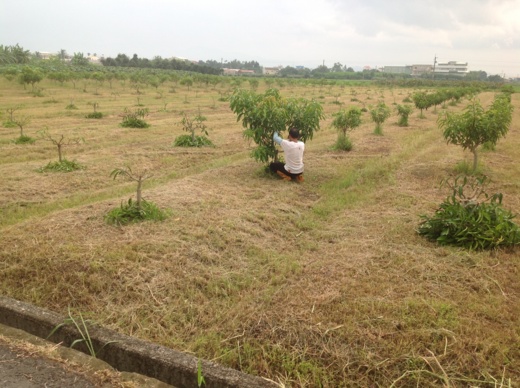 照片中,小朱正在幫芒果樹理髮, 那個平頭的, 是剛修過的。