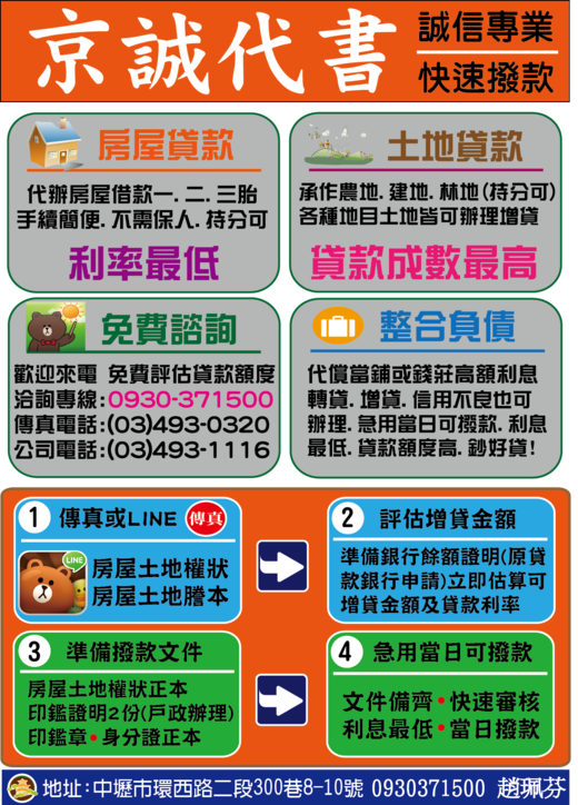 京誠代書專辦:全省房屋二胎三胎借款,土地二胎三胎借款(建地.農地.山坡地.林地及各種科目土地都可.持分也可以借款),房屋土地坪數大小都可以增貸.轉貸(套房可借)貸款成數高,利息低,彈性還款<隨時借,隨時還>還款退息最划算,急用可當日撥款。(法院查封中或銀行信用不良也可以借款)土地房屋貸款.增貸.轉貸.就找信譽最好的京誠代書~ 免費諮詢電話:0930371500趙珮芬 或撥 0917103838趙珮芬(可+LINE) 地址:中壢市環西路2段300巷8之10號1樓 TEL:03-4931116