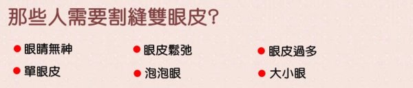 割式雙眼皮比較適合眼皮較厚、皮下脂肪較多、皮膚較鬆弛的人,眼皮肥厚,眼裂細小。通常切開式會比較徹底,具有術後雙眼皮持久不變形的優點。但是相對的,這種方法也因為進行的手術步驟較多一些,所以術後消腫、恢復時間也較久。