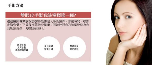 雙眼皮手術方法大致可分兩大類-縫合或割式,至於那一種方法較為適合,必須依患者本身眼皮的鬆弛度、眼皮下垂程度、脂肪多寡以及眉毛與眼睛間的距離來決定。 兩種方法之持久性略有差異,重要的是,必須排除先天性或病態性的眼瞼下垂,如果是提眼瞼肌無力(ptosis)的患者,在做雙眼皮手術前,則需先在提眼瞼肌處做縮短或吊高的處理,以避免手術後有大小眼的問題發生。