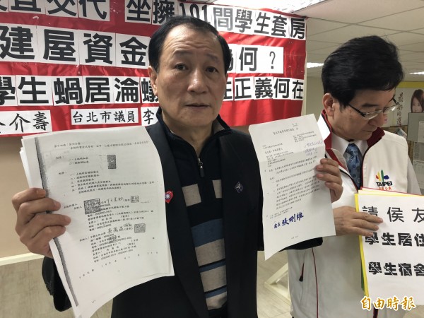 今上午與金介壽一同開記者會的台北市議員李慶元說,侯友宜至少是貪心的人!其投資的又昱實業公司,向文大年收1千5百萬元租金、每年漲租5%,且文大需支付5%營業稅,導致影響學生居住正義;侯友宜出租為2人1間房,文大改為4人1間房,入住學生多找人頭頂替才擁有較大居住空間,蝸居成蟻居。